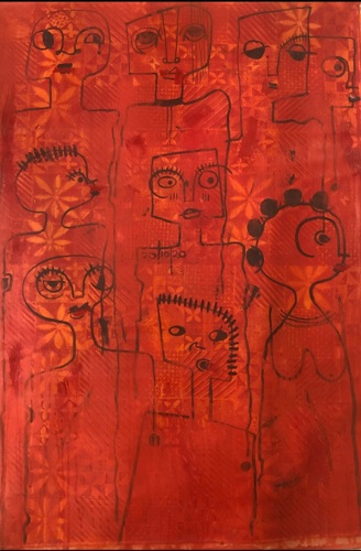 The red hue becomes both a metaphor for power and a warning of bloodshed, while the distorted human forms evoke the facelessness of the oppressed and the moral disfigurement of corrupt systems. Beneath the rhythmic Yoruba-inspired motifs lies a coded resistance, an insistence on cultural memory amid social decay.