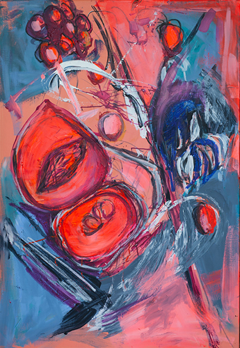 MH: Elan Vital (acrylic on canvas, 80 x 120 cm, 2025), last summer i started to explore in my drawing the theme of peach fruit and their seeds, the study of texture colour and shape of it. It caught me that nature is simply fascinating in its variety of forms and shapes, during this period I experienced a personal tragedy, I had a miscarriage, and in fact, painting a tree with peaches reminded me of a manifestation of a woman's fertility, how many fruits she can produce and how beautiful and strong is the will to live and pass on her genes. So painting has this healing effects on me thru creating process you can transform yours own traumas thats why the title of this painting is 'Elan Vital'.