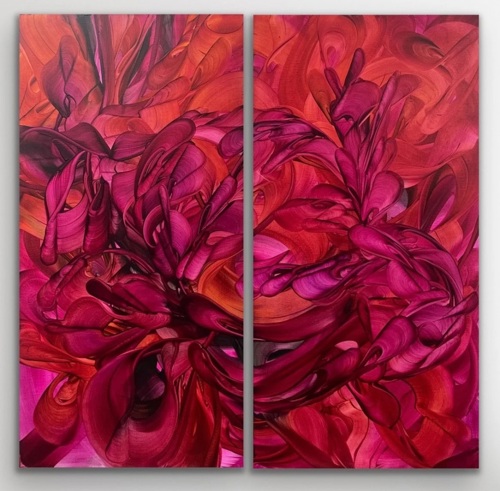 Following the success of her 2025 exhibition at Ronchini titled Flourish, and the acclaim of her White Cube Hong Kong solo exhibition the same year, Canadian-born London-based Michele Fletcher reaches her most emphatic painterliness in this diptych. Brushstrokes are vivid, lush, and tactile, turning the canvas into a site of flux and motion. These petals begin to unfurl into a cyclical shape, in turn challenged by the format of the diptych itself, lending viewers a visual pause between the rhythm of the composition.