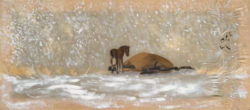 Executed in oil on hand-primed embroidered silk, Foal (First Snowfall) depicts a young foal standing beside its fallen mother as a light blanket of snow drifts softly around them. The work reflects on the passing cycles inherent to nature—moving from the vitality of spring, associated with birth and new life, toward the quiet descent into winter, when things perish, beings mature, and the world turns inward.