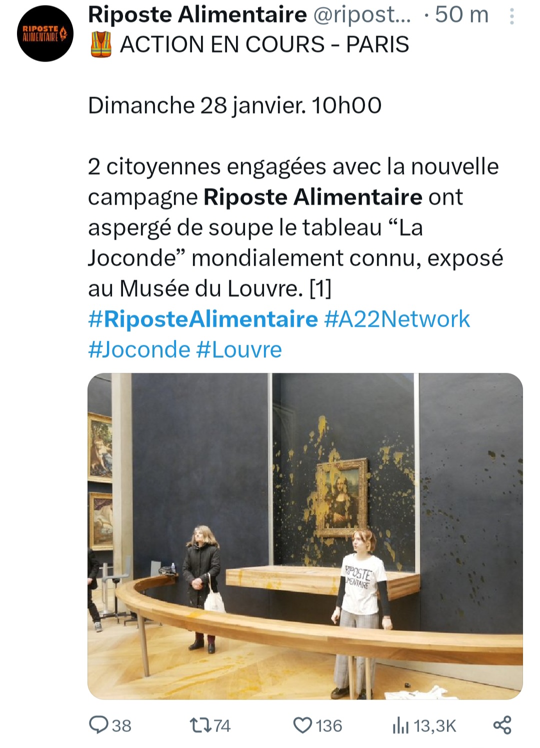 Both are wearing a shirt with Riposte Alimentaire written on the front, referring to a climate activist group. A glass window protects the Mona Lisa, so the soup would not have damaged the painting itself.