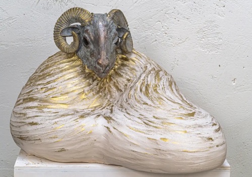 Thomas Pucci, Ram with the Golden Fleece. Raku ceramic, polychrome bronze and brass metal, glass, wax gold. 2025 Size: 46 x 38 x 46 cm