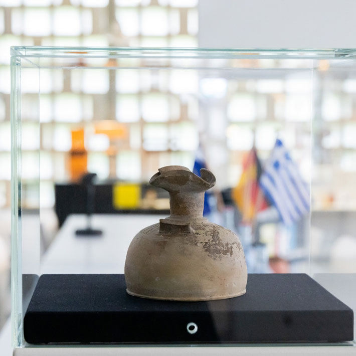 The trefoil-shaped wine bottle with a stopper, dating back to 620-600 BC, which preserves traces of written decoration around the neck, was brought to the museum in 1986 by Geology professor Dr Hannfrit Putzer.