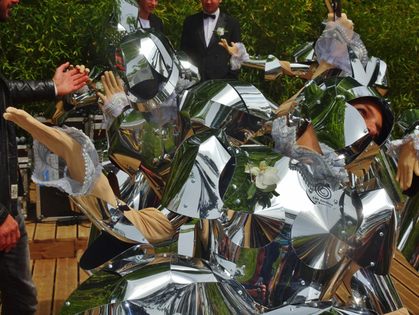 The official opening of Double Jeu saw a brass band at the top of the Gardens and a seafood buffet down at the bottom, on a wooden stage that also hosted a spectacular choreographic performance starring seven spritely female ‘knights’ clad in gleaming armour made from silver-mirror polysterene (below) and clutching spades, shears and watering-cans to embody ‘protective garden spirits.’