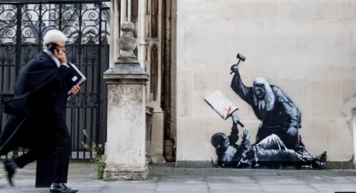 The mural appeared on an external wall of the Queen's Building, in the Royal Courts of Justice complex, on Monday.