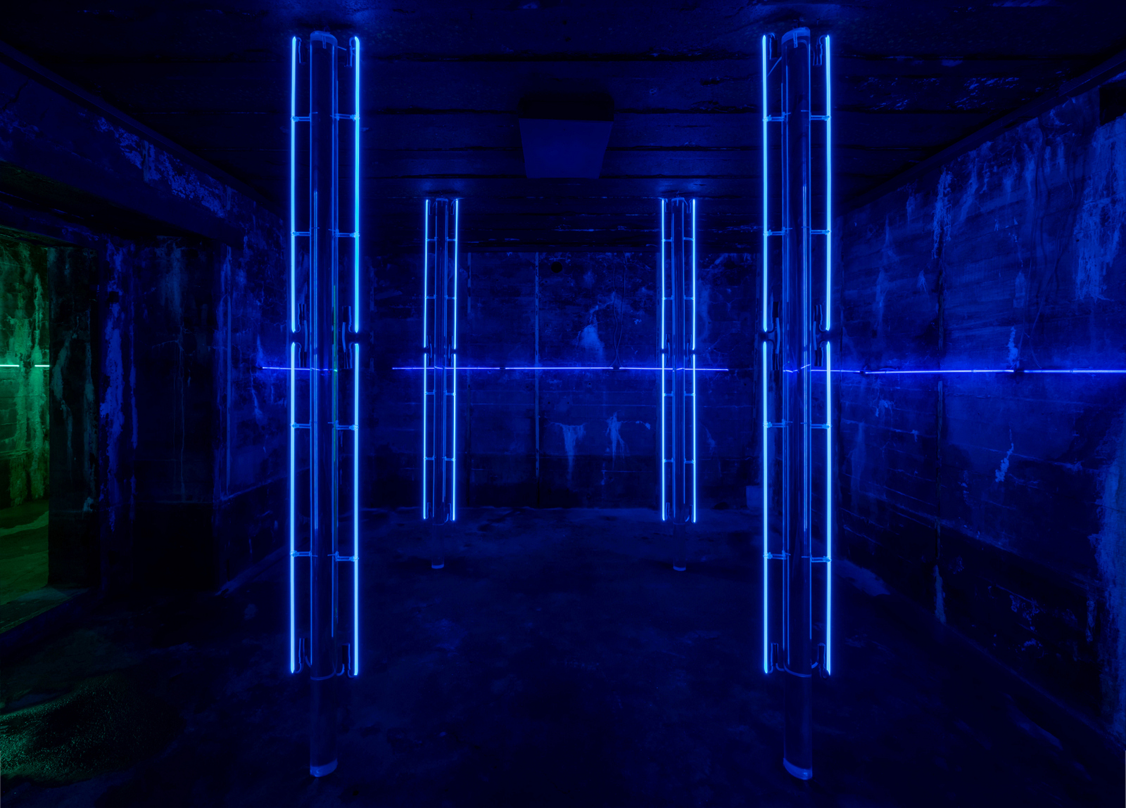 Another important work for me is my last multi chromatic neon sculpture installation, Poiesis created for Kunsthal Regelbau 411 in Denmark in 2023. The contemporary art center consists of a set of former WWII bunkers located on the Atlantic coast of Denmark, where entropy is extremely present and enhances the emotionality of its dark history. The remnants of war are repurposed, transforming any notion of their original usages. Structurally, the two bunkers and their labyrinthian interiors are semi exposed, there are no doors, and located in coastal climate, the concrete walls have natural growth, salt, rust and cracks, which enhances the beauty of the neon, color and the minimal nature of the installations. I basically created a museum level installation in a desolate, windblown, remote place.