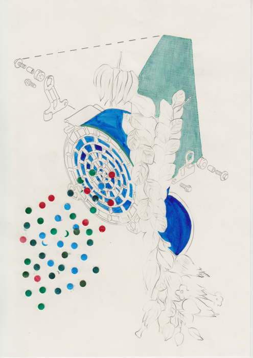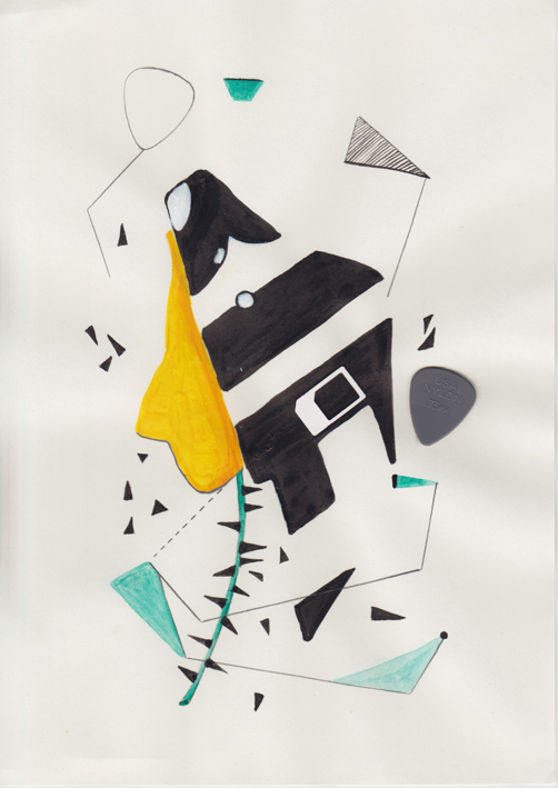 Constellation with plectrum, 2017, drawing/collage, Pencil, East-Indian ink, watercolour, pasted plectrum and pasted sim-card leftover on paper, 29,7 x 21 cm, the artwork is on sale at The Art Lodge Gallery