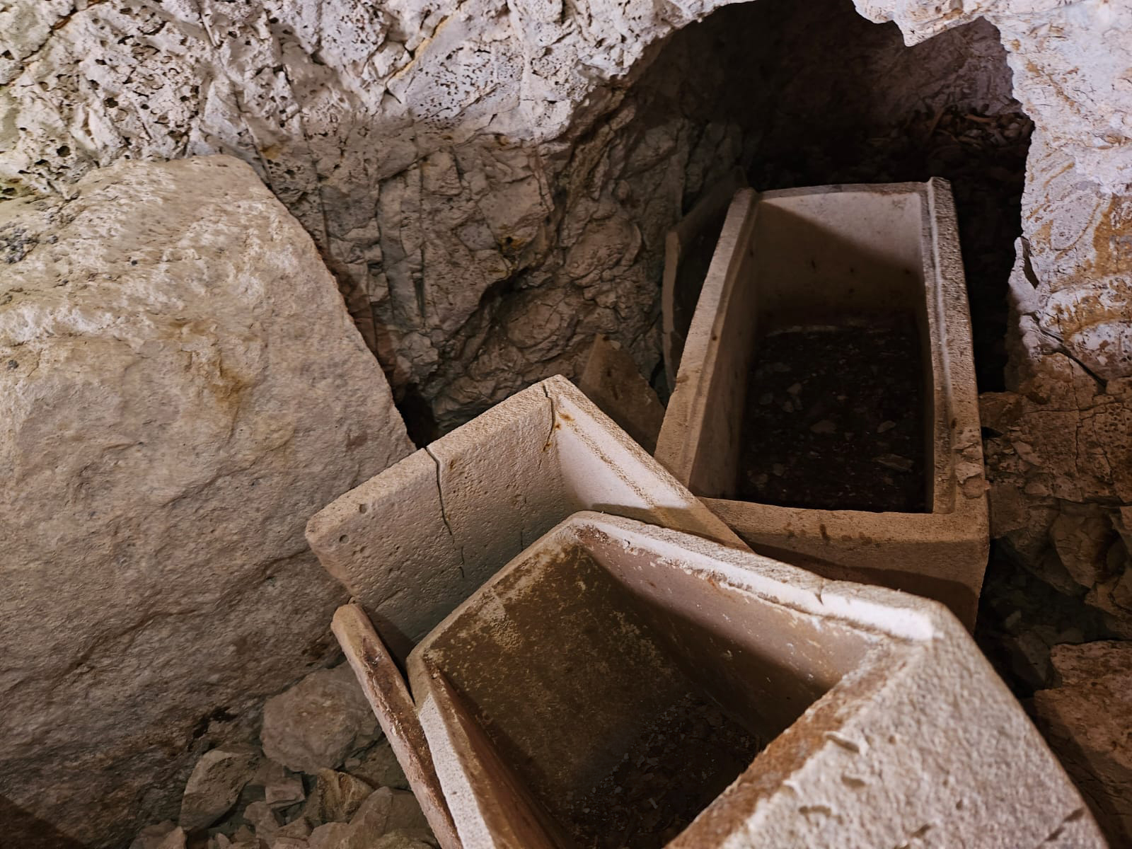 The inspectors of the Israel Antiquities Authority Theft Prevention Unit then noticed several piles of earth in the plot that seemed to conceal something behind them. To their astonishment, the removal of the earth revealed a second rock-hewn burial cave with nine burial niches, also damaged by the earthworks. Three decorated stone ossuaries and fragments of other ossuaries were found inside the cave. The ossuaries were found empty and not in their original location, raising the immediate suspicion that the cave had recently been looted.